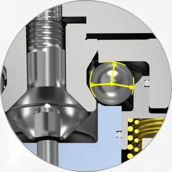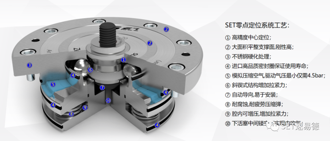 Outra característica do sistema de ponto zero é sua função dupla: o posicionamento e o aperto são realizados simultaneamente, com precisão inferior a 5 μs. O curto pino de posicionamento cônico torna a superfície de contato completamente fechada e tem a função do auto-bloqueio. O aperto de posicionamento permite um certo desvio radial e desvio angular, que tem certas vantagens para carregamento e descarregamento automático ou manual.