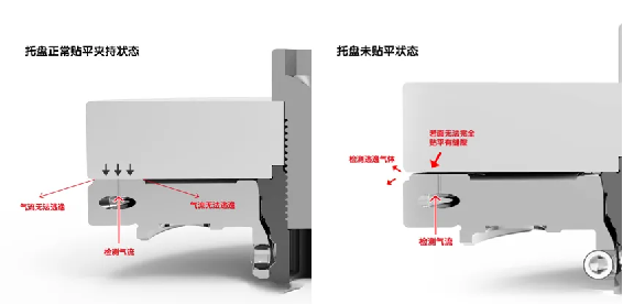 Para garantir a estabilidade da bandeja e atender aos requisitos de posicionamento, o posicionador zero deve adicionar um dispositivo de detecção de fixação, o objetivo deste dispositivo é garantir que o posicionador zero possa entrar em contato completamente com a superfície de posicionamento da bandeja e não haverá corte de ferro ou outros detritos no meio. Seu princípio de trabalho é mostrado na Figura (1). O ar de detecção liberará (0,2MPa) pressão de ar fora do orifício. Defina o valor de classificação do sensor de fluxo. Quando a bandeja não é plana com o posicionador, como mostra a Figura 2, o gás escape detectado escapa para fora ao longo da lacuna, e o sensor de fluxo determinará a diferença de fluxo, para realizar a detecção de fixação. O orifício de detecção também pulverizará a pressão de limpeza de 0,6MPa para garantir a limpeza do estoma. Vários localizadores podem ser detectados simultaneamente, reduzindo assim os custos; 2. Uma vez que houver um valor de fluxo de vazamento em vários posicionadores, será inconsistente com o valor de fluxo predefinido, por isso é mais seguro; 3. O método de detecção é mais direto, a bandeja não é carregada e o clipe vazio do posicionador pode ser detectado.